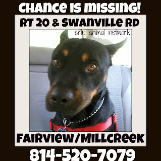 Lost dog alert: Chance a newly adopted rescue dog went missing today around 3pm from Swanville Rd & Rt 20 in the Millcreek/Fairview area. He is wearing a red collar. He may be shy, but is friendly. If you see Chance, or have any information, please call 814-520-7079.